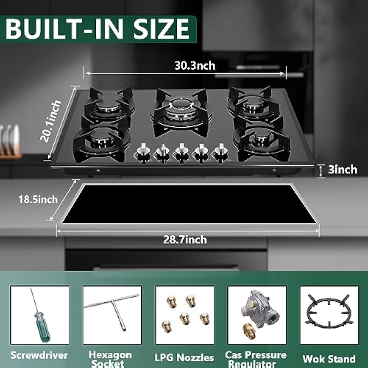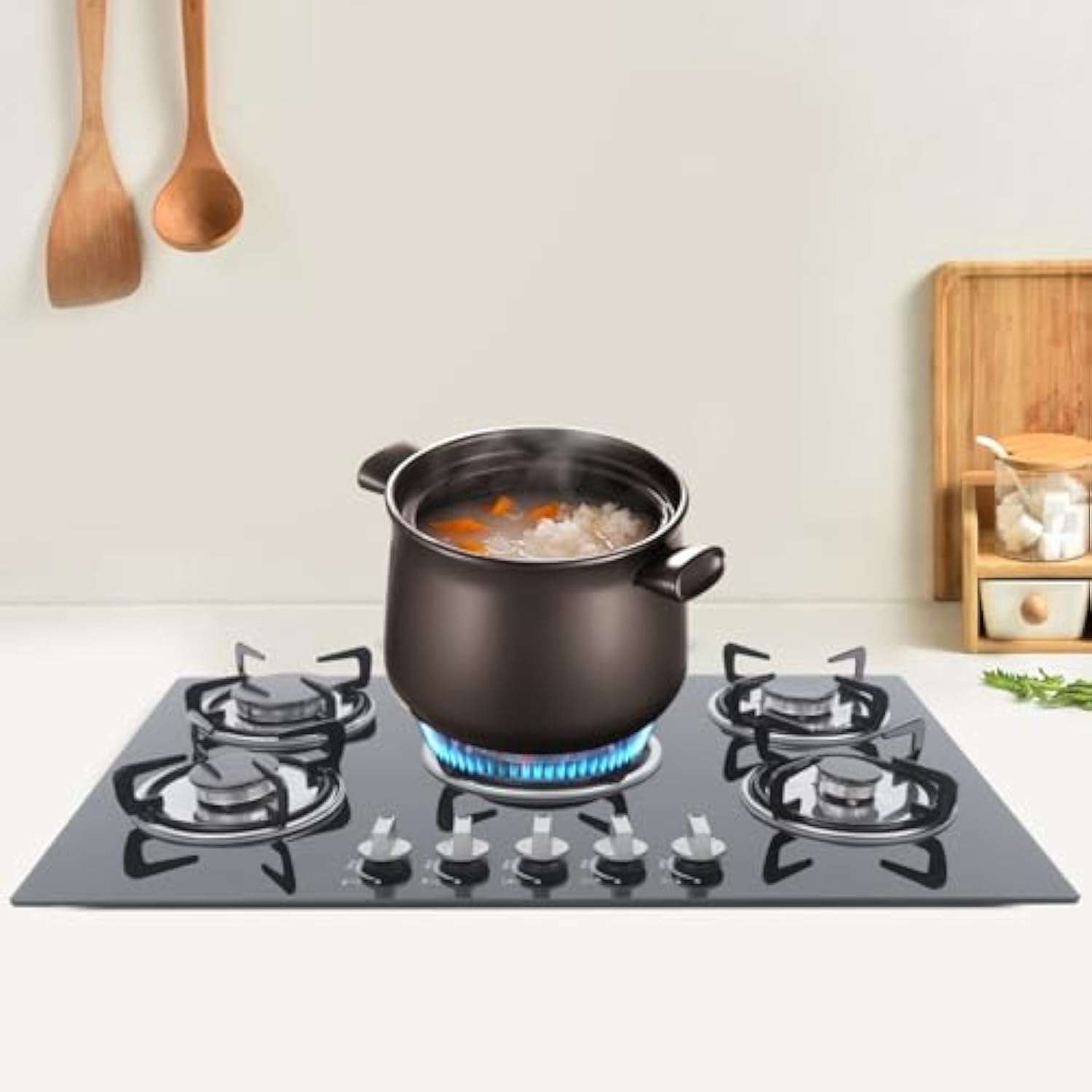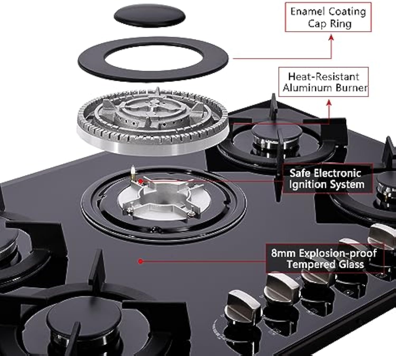 ESTUFA DE GAS CON TABLERO DE VIDRIO - Fabricada con una superficie de vidrio templado negro de 8 mm de grosor, esta estufa de gas de 30 pulgadas ofrece una apariencia elegante y contemporánea, fácil de limpiar. El diseño de una sola pieza sin costuras evita que los derrames lleguen al interior, garantizando un mantenimiento sin complicaciones.